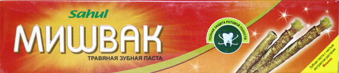 Аюрведична трав'яна зубна паста "Mишвак" призначена для чищення зубів і масажу ясен. В'яжучі і бактерицидні властивості зубної пасти "Mишвак" скорочують карієс зубів, захищають ясна і запобігають хворобам зубів, створюють приємний запах у роті, залишаючи солодкий присмак анісу. "Mишвак" містить природні травянные ингридиенты.