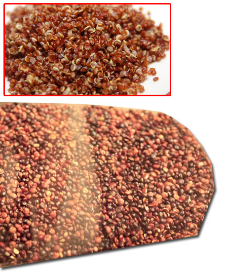 червона кіноа менше розварюється, зберігає форму і колір, має привабливіший екзотичний вигляд. Зерна трохи більше і кращої якості;